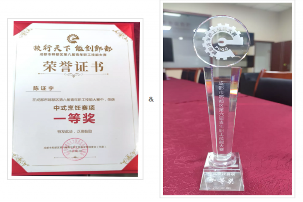 ? ? ? ?經(jīng)過(guò)激烈角逐,丁點(diǎn)兒股份陳證宇過(guò)關(guān)斬將,憑借扎實(shí)的功底及完美的表現(xiàn)脫穎而出,榮獲中式烹飪賽項(xiàng)一等獎(jiǎng)。