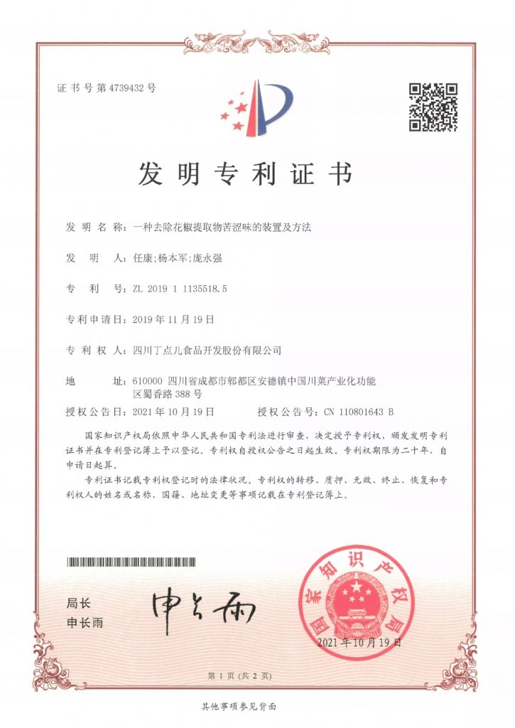 ? ? ? ?近日,丁點(diǎn)兒股份創(chuàng)新研發(fā)出《一種去除花椒提取物苦澀味的裝置及方法》并獲得國(guó)家發(fā)明專利授權(quán),這是公司在花椒及花椒制品研究方面取得的第4項(xiàng)國(guó)家發(fā)明專利。