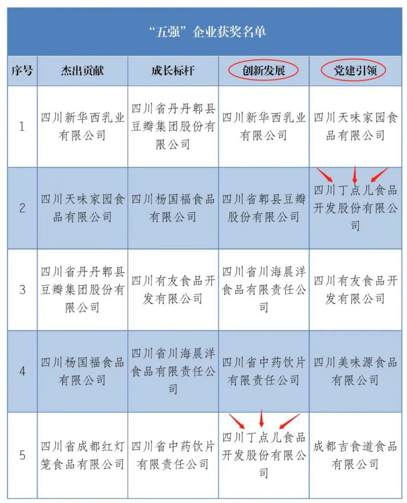 ? ? ? ? 作為園區(qū)標(biāo)桿企業(yè),丁點(diǎn)兒股份獲評創(chuàng)新發(fā)展“五強(qiáng)”企業(yè)和黨建引領(lǐng)“五強(qiáng)”支部雙項(xiàng)榮譽(yù),董事長任康榮獲招商引智“五好”個人稱號。這是郫都區(qū)川菜產(chǎn)業(yè)城管理委員會對丁點(diǎn)兒股份的高度認(rèn)同及期望。