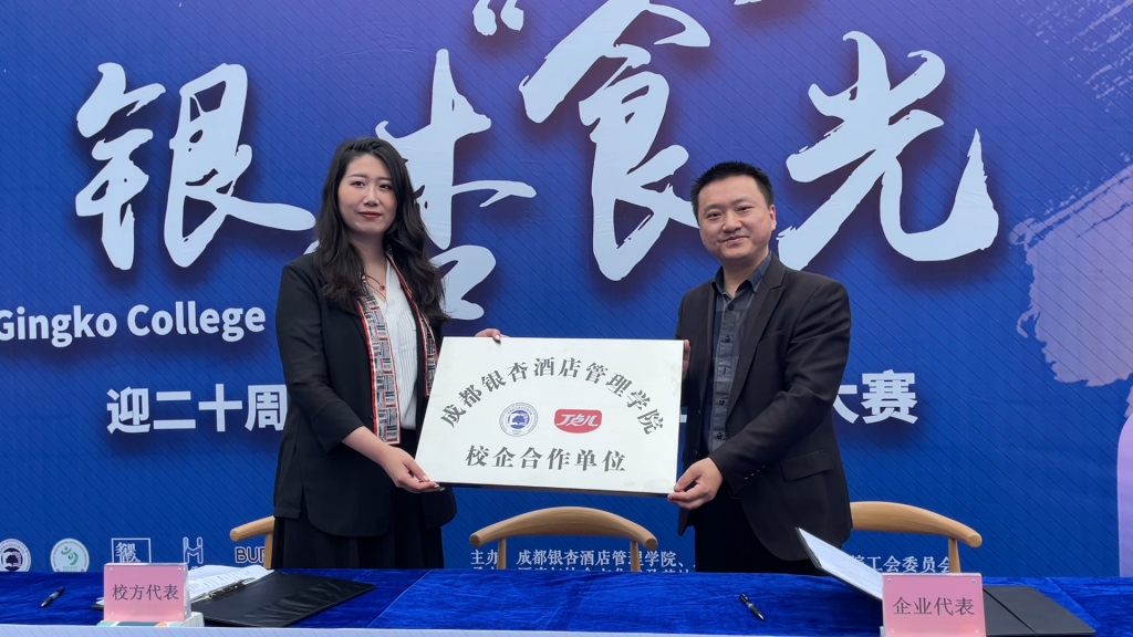 ? ? ? ?隨后,成都銀杏酒店管理學院酒店管理系執(zhí)行系主任徐君宜、丁點兒股份技術中心產品應用培訓部副部長陳證宇代表雙方簽署戰(zhàn)略合作協議。徐主任代表學校向丁點兒股份授予了“校企合作”牌匾。至此,雙方正式達成校企合作共識。希冀通過雙方的共同努力,將丁點兒股份的品牌文化及產品風味根植在餐飲烹飪學子的心中,同時促進成都銀杏酒店管理學院烹飪學院優(yōu)秀畢業(yè)生將富含丁點兒風味的美食作品更多的呈現在消費者的餐桌之上。