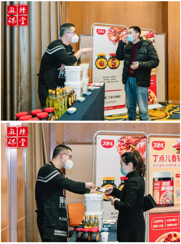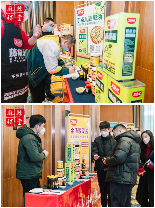 在丁點(diǎn)兒股份產(chǎn)品展示區(qū),藤椒油、干鍋醬、椒麻雞汁、金湯酸菜醬等豐富的產(chǎn)品吸引了眾多參會(huì)人員駐足詢問(wèn)了解??谖斗€(wěn)定,快速出餐,可優(yōu)化菜品成本,有效提高翻臺(tái)率等優(yōu)勢(shì)給大家留下了深刻印象。