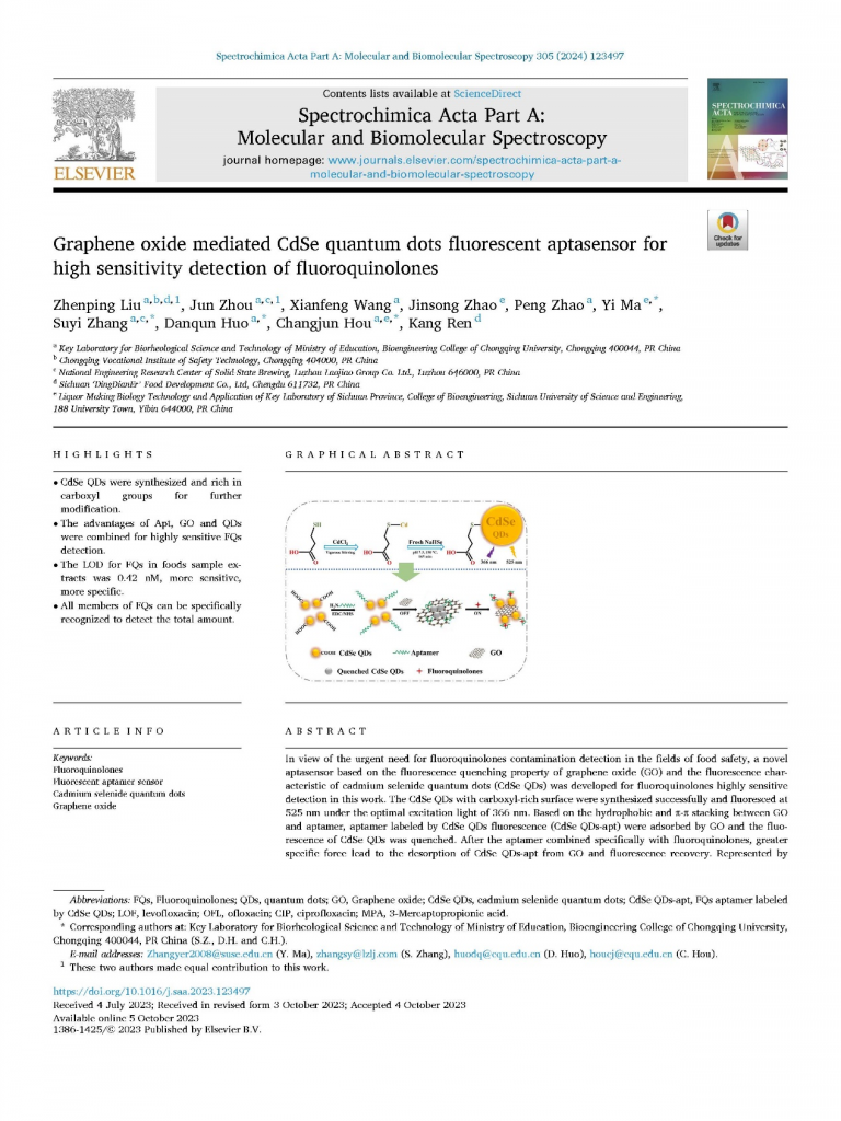 同樣是近日,由丁點(diǎn)兒股份董事長(zhǎng)任康和企業(yè)發(fā)展顧問劉振平博士共同署名,與重慶大學(xué)等單位共同完成的基于量子點(diǎn)的創(chuàng)新技術(shù)成果《Graphene Oxide mediated CdSe quantum dots fluorescent aptasensor for high sensitivity detection of fluoroquinolones》(《氧化石墨烯介導(dǎo)的硒化鎘量子點(diǎn)熒光適配體傳感器對(duì)氟喹諾酮類抗生素的高靈敏檢測(cè)》【點(diǎn)擊跳轉(zhuǎn)原文】)在國(guó)際權(quán)威期刊(JCR Q1區(qū))《Spectrochimica Acta Part A Molecular and Biomolecular Spectroscopy》發(fā)表,國(guó)家發(fā)明專利也已公布并進(jìn)入實(shí)質(zhì)審查階段。