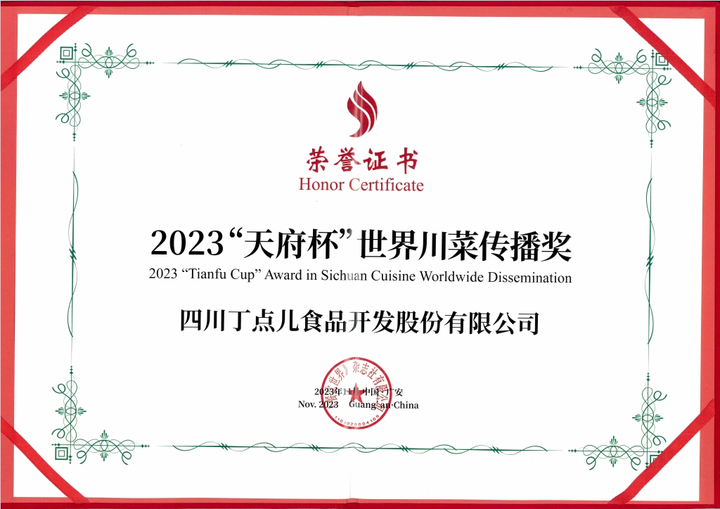 憑借出色的企業(yè)影響力和巨大的發(fā)展?jié)摿?,丁點兒食品在這一年又?jǐn)孬@了多項榮譽?!澳甓瘸壠放浦恰?、2023“天府杯”世界川菜傳播獎、第十一屆中國食材電商節(jié)-優(yōu)質(zhì)企業(yè)推薦等稱號,充分展示了行業(yè)對丁點兒食品實力的肯定。