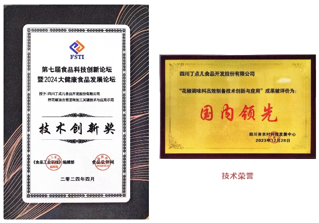 依托行業(yè)領(lǐng)先技術(shù)創(chuàng)新體系,丁點(diǎn)兒食品不斷取得重大行業(yè)技術(shù)突破,獲授權(quán)國(guó)家專(zhuān)利50余項(xiàng)。其中,“花椒調(diào)味料高效制備技術(shù)創(chuàng)新與應(yīng)用”被評(píng)為國(guó)內(nèi)領(lǐng)先,“鮮花椒油去苦澀味加工關(guān)鍵技術(shù)與應(yīng)用示范”獲“技術(shù)創(chuàng)新獎(jiǎng)”,充分彰顯了企業(yè)在食品科技領(lǐng)域的創(chuàng)新實(shí)力和核心競(jìng)爭(zhēng)力。