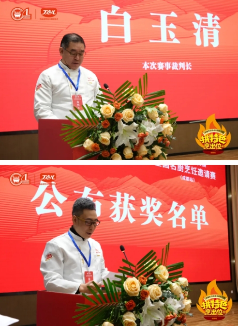中國(guó)烹飪協(xié)會(huì)名廚專(zhuān)委會(huì)常務(wù)副主席、本次大賽裁判長(zhǎng)白玉清作了賽事點(diǎn)評(píng);中國(guó)烹飪協(xié)會(huì)名廚專(zhuān)委會(huì)常務(wù)副主席、四川旅游學(xué)院教授、本次大賽監(jiān)審長(zhǎng)蘭明路宣讀了金獎(jiǎng)前十名名單。